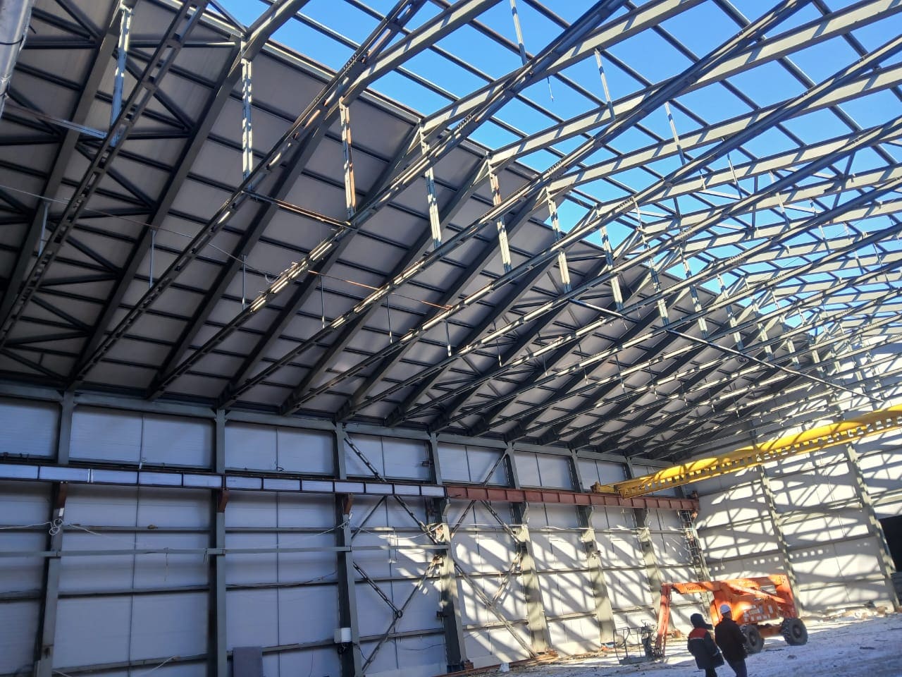 Осуществляется доставка и установка металлических конструкций каркаса. Затем производится монтаж стен и кровли – утепленных сэндвич-панелей или тентового покрытия.